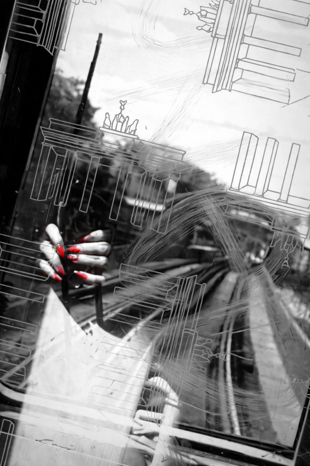 Sie trägt ein kurzes schwarzes Kleid, rote Pumps, lange rote Fingernägel, roten Lippenstift.